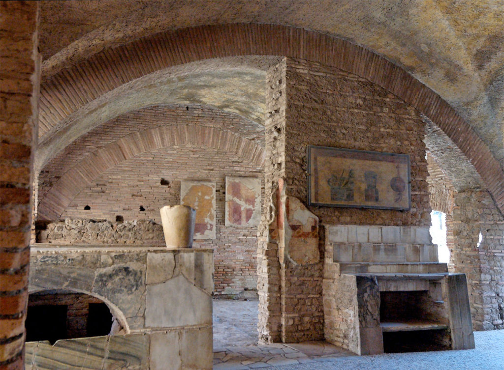 The name Ostia is derived from Ostium (river mouth), and Ostia Tiberina, first name of the city, referred directly to the “door” of the Tiber River from which Romulus and Remus, according to the legend, went up the river in a basket before being found and nursed by the she-wolf. In Ostia, long ago, the Tiber ended its course in correspondence of the remains of the ancient Porto Fluviale. First a Roman colony, founded, following the myth, by the King Ancus Marcius, today it is among the most visited archeological sites in the world, and the third in Italy. A visit to the scavi offers a unique opportunity to re-live the ordinary daily life in Ancient Rome. Inhabited by merchants, soldiers, manual laborers and artisans, Ostia was a warehouse and a sorting center of goods destined for Rome, and, for this reason, it grew in richness, wealth and prestige. Shops and public spaces, including theaters, baths, termopoli (ancient bars) and a Capital Ostiense (Campidoglio Ostiense) in the Forum of the city, substituted during the years the ancient castrum (military camp). A harbor city and a junction between the only means of communication of that time, Ostia, from the beginning had a cosmopolitan soul: here people of different customs and traditions lived together in harmony. In Ostia we can admire the ruins of sites dedicated to various cults, from Mithraism to the cult of Isis; here we find also the oldest synagogue in Europe. Connected to the whole Mediterranean, Ostia recounts the life of the Romans in all of its aspects, above-all in reference to the period following the destruction of Pompeii (79 A.D.).